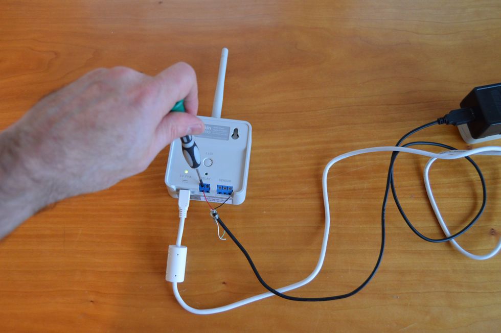 Then I connect one of the cable's wires and one from the fan to the Maker module's relay switch and screw them down.