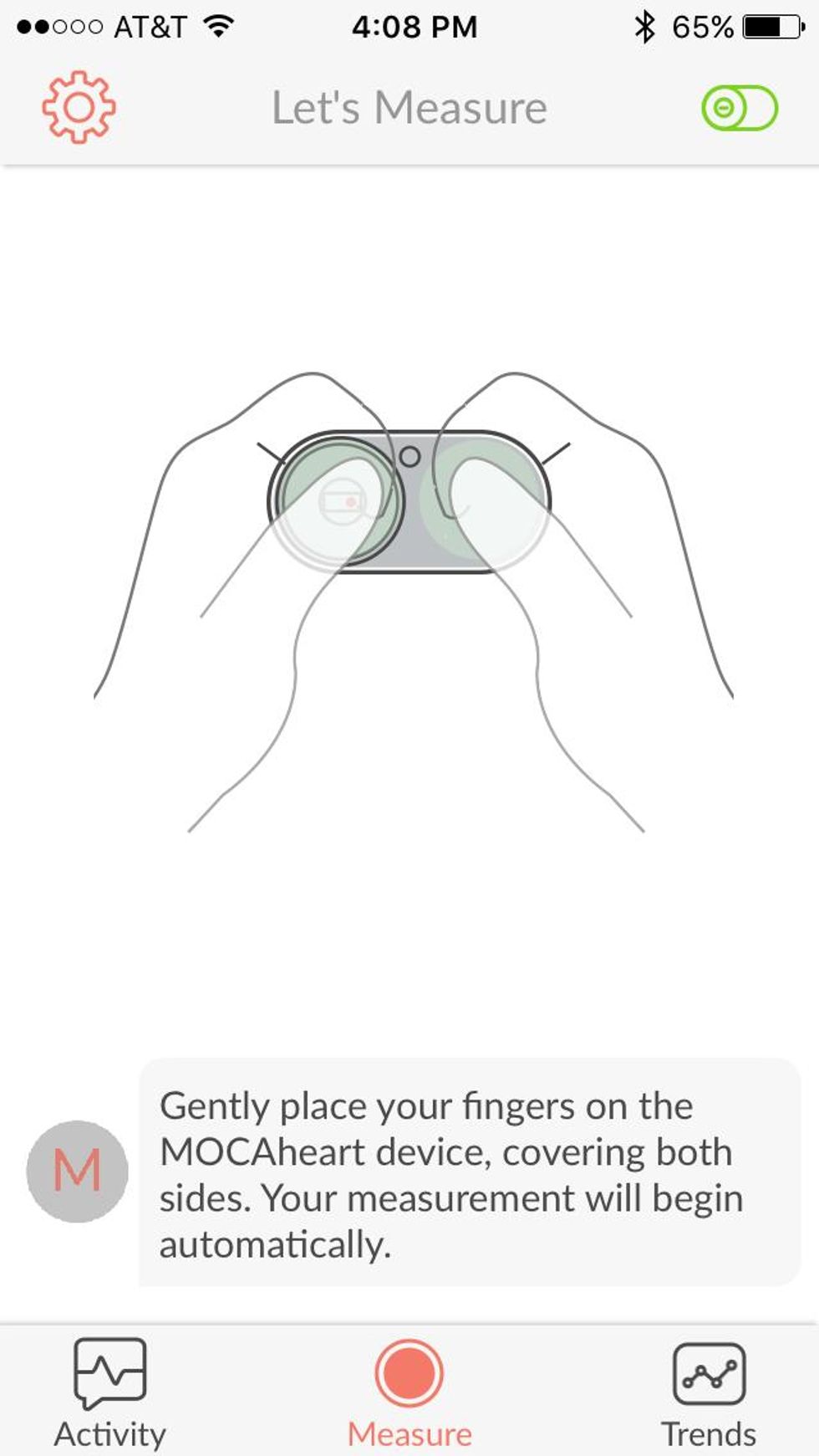 MOCAheart takes advantage of a sensor in the device to read your heart's electrical signal as to when blood was pumped by the heart—and when that blood reached your fingertip. That speed is the blood velocity. The device can also read read the time between each pump, or beat and beams light through your finger, as well, to detect how oxygenated your blood actually is. Pro tip: You want a lot of oxygen in your blood. Normal would be 95 percent to 99 percent.