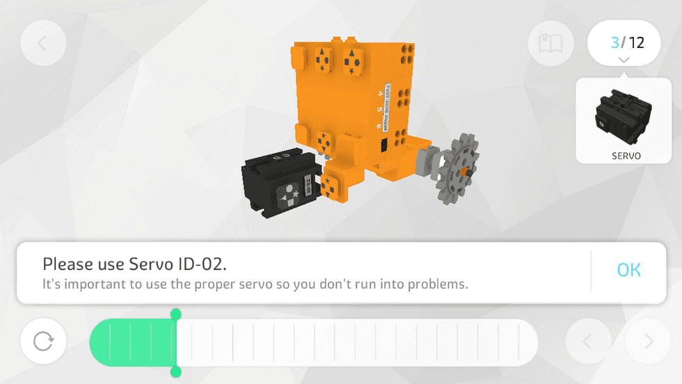 On the plus side, the app is clearly marked, even animated, showing you how each piece slides into place. You can go backward to repeat a step to make sure you're putting the pieces together correctly. (I did this several times.) You can also rotate the image in 3D, plus zoom in and out. This last feature is absolutely genius. And you'll need it to make sure you have pieces turned the right way, that attachments are connected to the right connectors, that you've got a piece facing on the AB side rather than the CD side, for example, and that you've used the right servo motors in the right place.