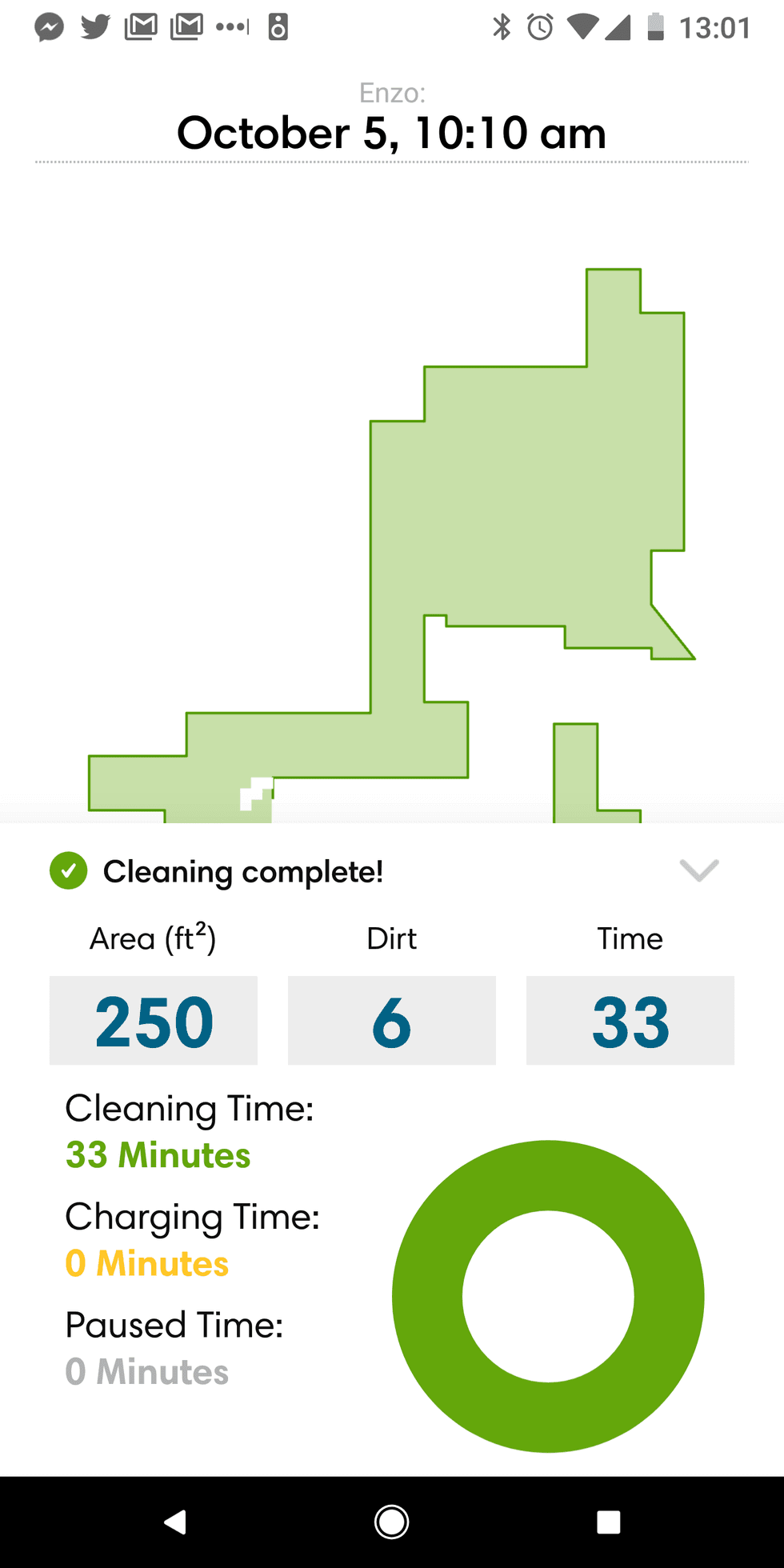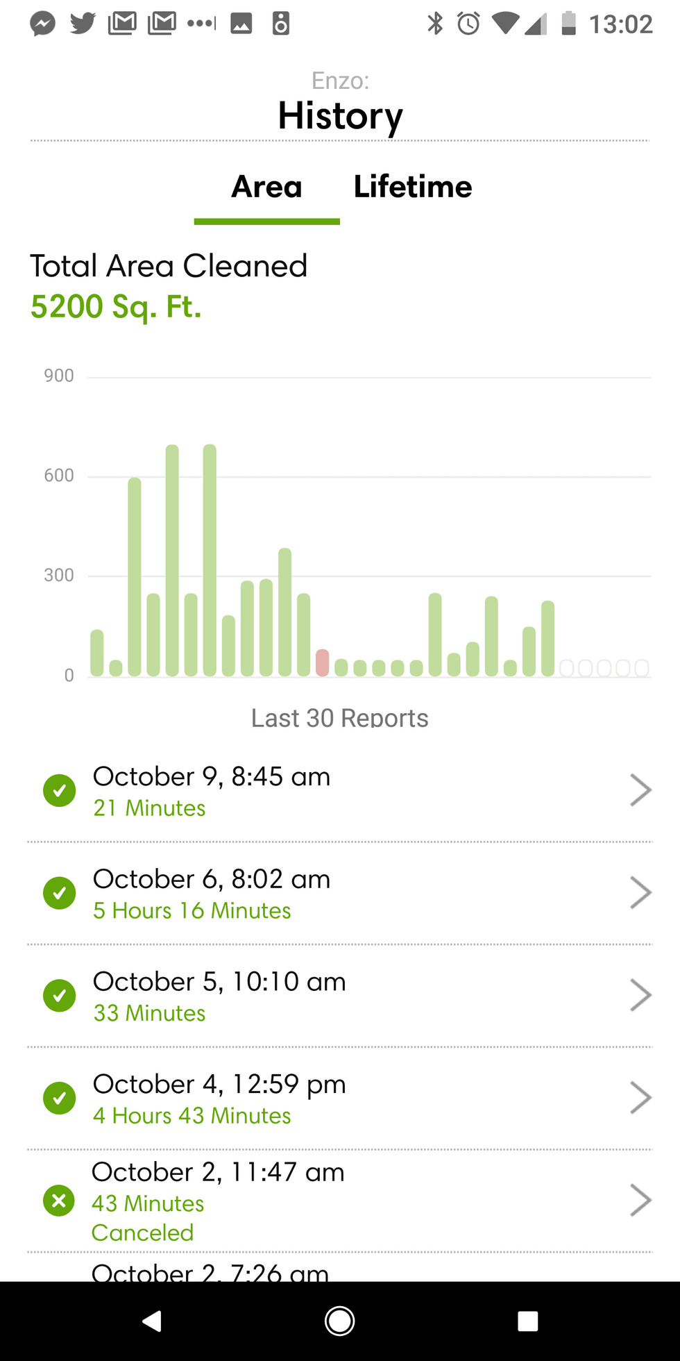 Want to see how Roomba's doing? You can pull up a history page full of stats: how much floor space your Roomba has cleaned in its lifetime, and also how long each cleaning job lasted. The settings page lets you control features like 'carpet boost', which increases suction power over carpet, and 'edge clean' which is where the Roomba seeks out walls and cleans thoroughly along them. Finally, the Roomba can be set to pass over the floor once, twice, or as often as the device sees fit.