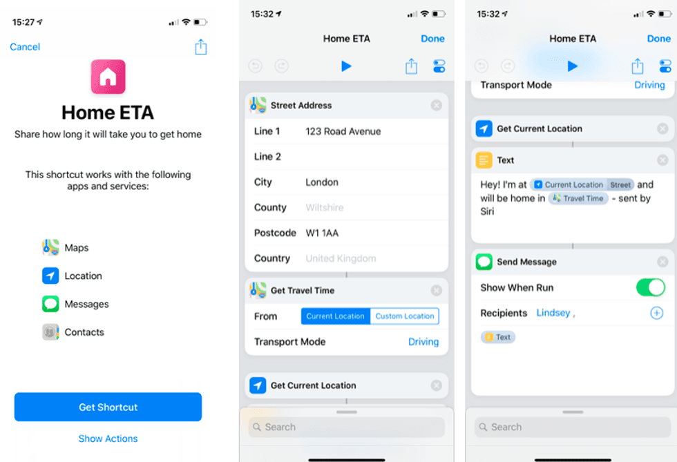 Now let us explain how the above shortcut was created - albeit using a fictional home address and recipient name - by modifying a shortcut produced by Apple.