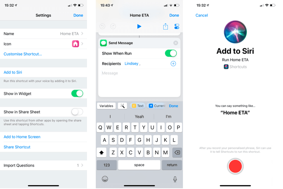 Now tap on the settings icon below 'Done' in the top-right corner. Here, you can change the name and icon of the shortcut, and link it to a Siri command. To do this, tap 'Add to Siri', then tap on the red record button and say whatever you'd like the activation phrase to be. Something like 'Tell [name] when I'll be home', or 'Share by ETA with [name]' will work just fine.