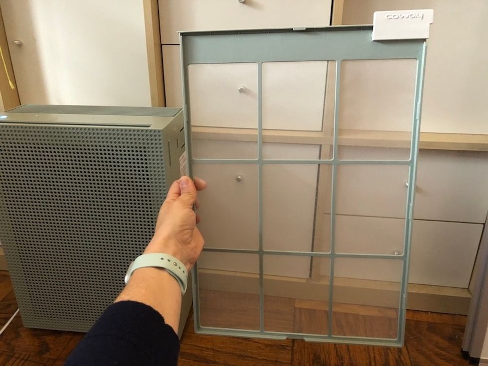 Filters come in and out by sliding them through the top with the Airmega 150. Inside are three: there's a pre-filter, a deodorization filter, which is meant to be replaced after six months, and a HEPA filter, which is designed to replaced after one year and can, says Coway, remove 99.99 percent of viruses and other airborne particles. We discussed this in detail in our review, and how we cannot prove this through our abilities.