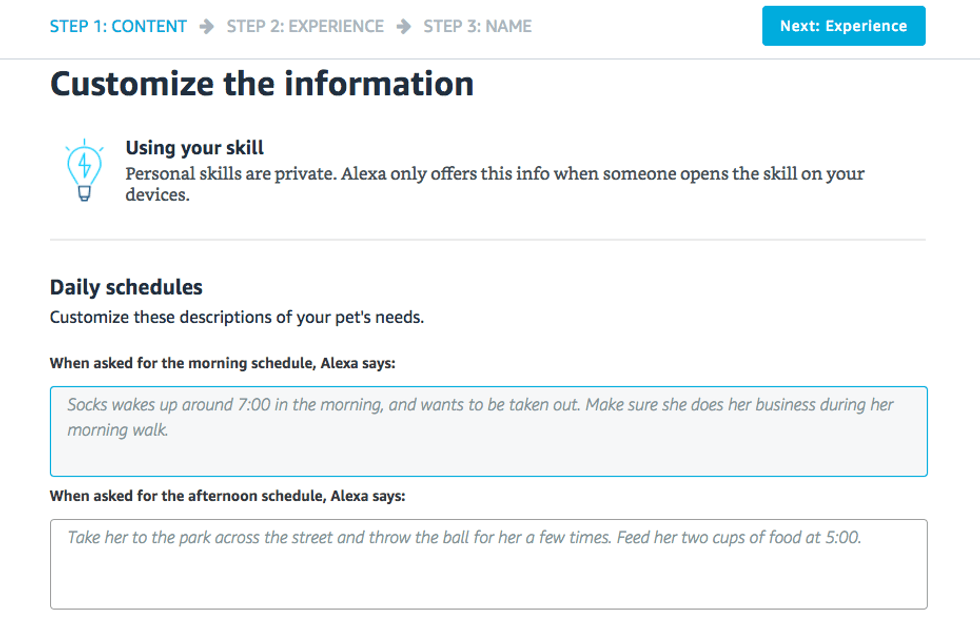 Making a blueprint for a Pet Sitter took about two minutes, with just nine basic fields to fill-in with answers for questions including "Alexa, How do I feed the dog?" And, "Alexa, Where is the dog food?"
