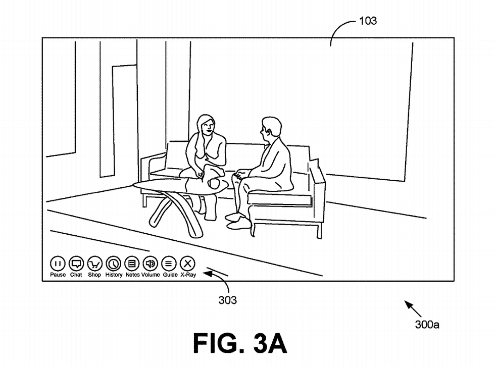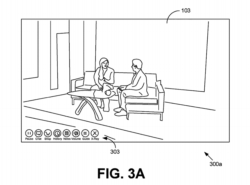 Further sketches show how a studio for the show could look. One image shows a pair of presenters sat on sofas. The user interface of this sketch includes several buttons for the viewer to click on; options include opening a chat, shopping, and X-Ray, which could be related to Amazon's service for learning more about programs on Prime Video, also called X-Ray.