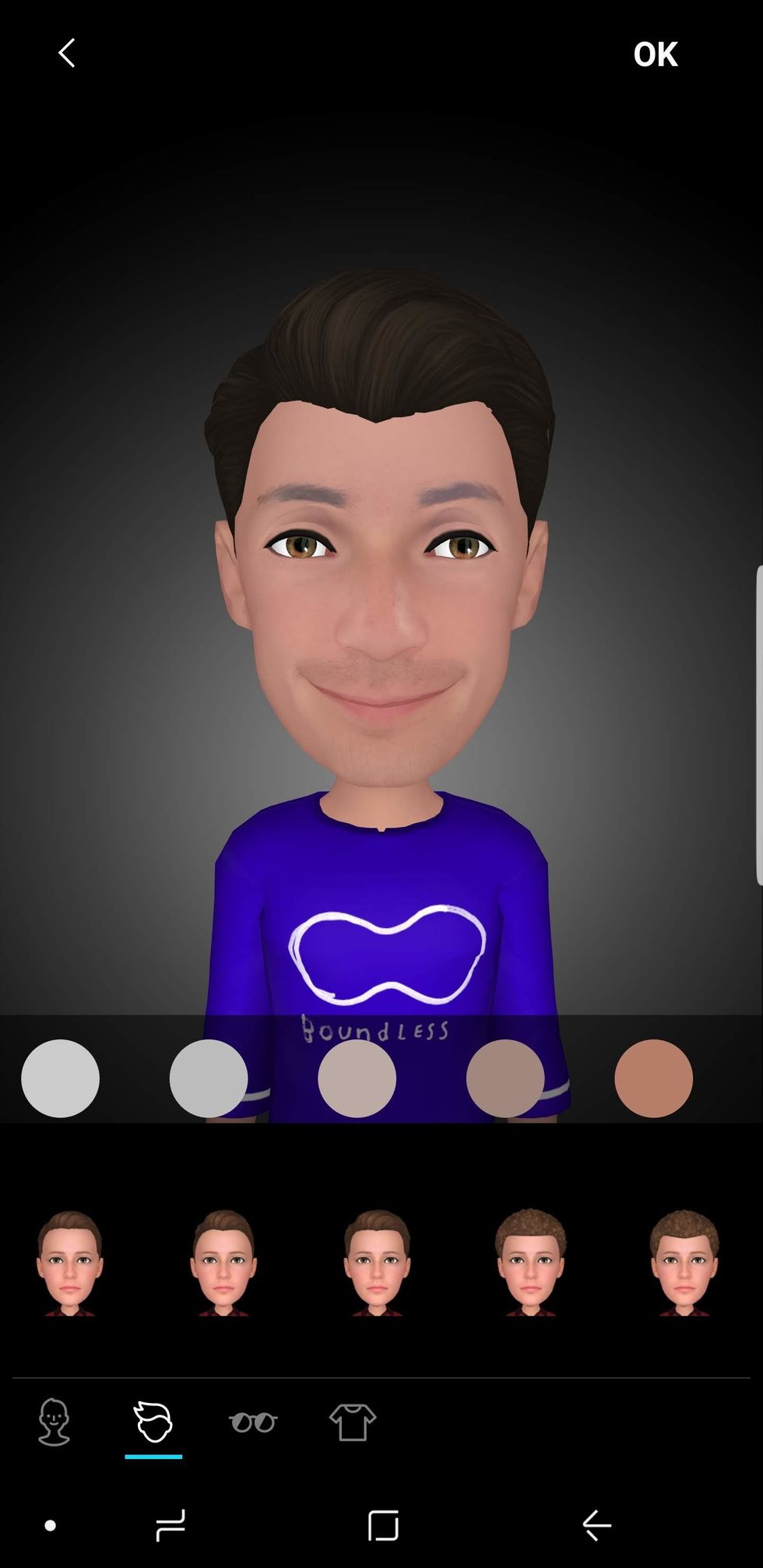 Galaxy S9 users are given a slider for adjusting skin tone and two options for the general shape of your face. After this, there are 31 hair colors to pick from, plus 50 hairstyles (including options for wearing a turban or hijab).