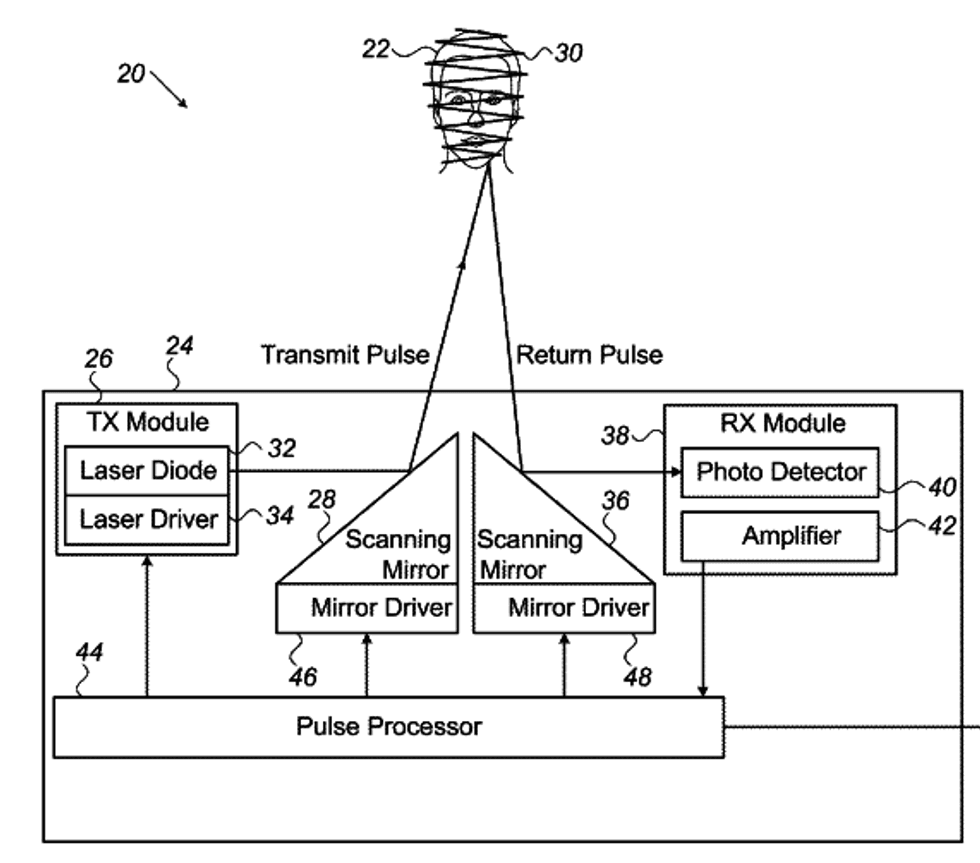 Apple earned a new patent on how to read the veins under the skin. Called "Vein imaging using detection of pulsed radiation," the patent covers how to use a transmitter to project infrared radiation on the skin, and then use a receiver to read images that come back of blood vessels underneath.