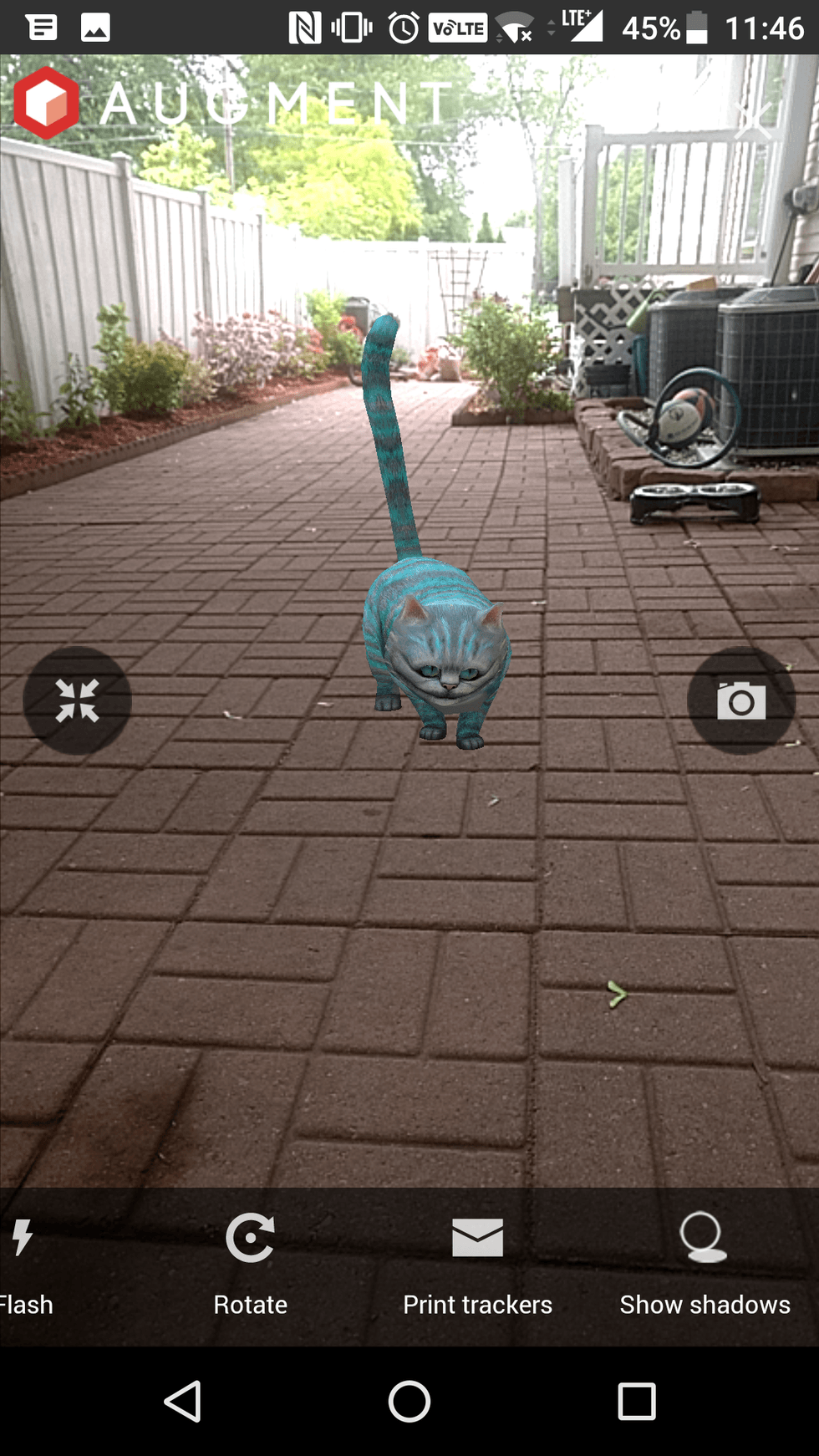 The finger motions were a bit rough at first as the object in my screen did not move easily. I tried moving a store kiosk around my backyard and it just did not work well. I then tried placing the cat from "Alice in Wonderland" and that worked better, if not kind of creepy. The graphics looked a bit blocky and sometimes glitchy.