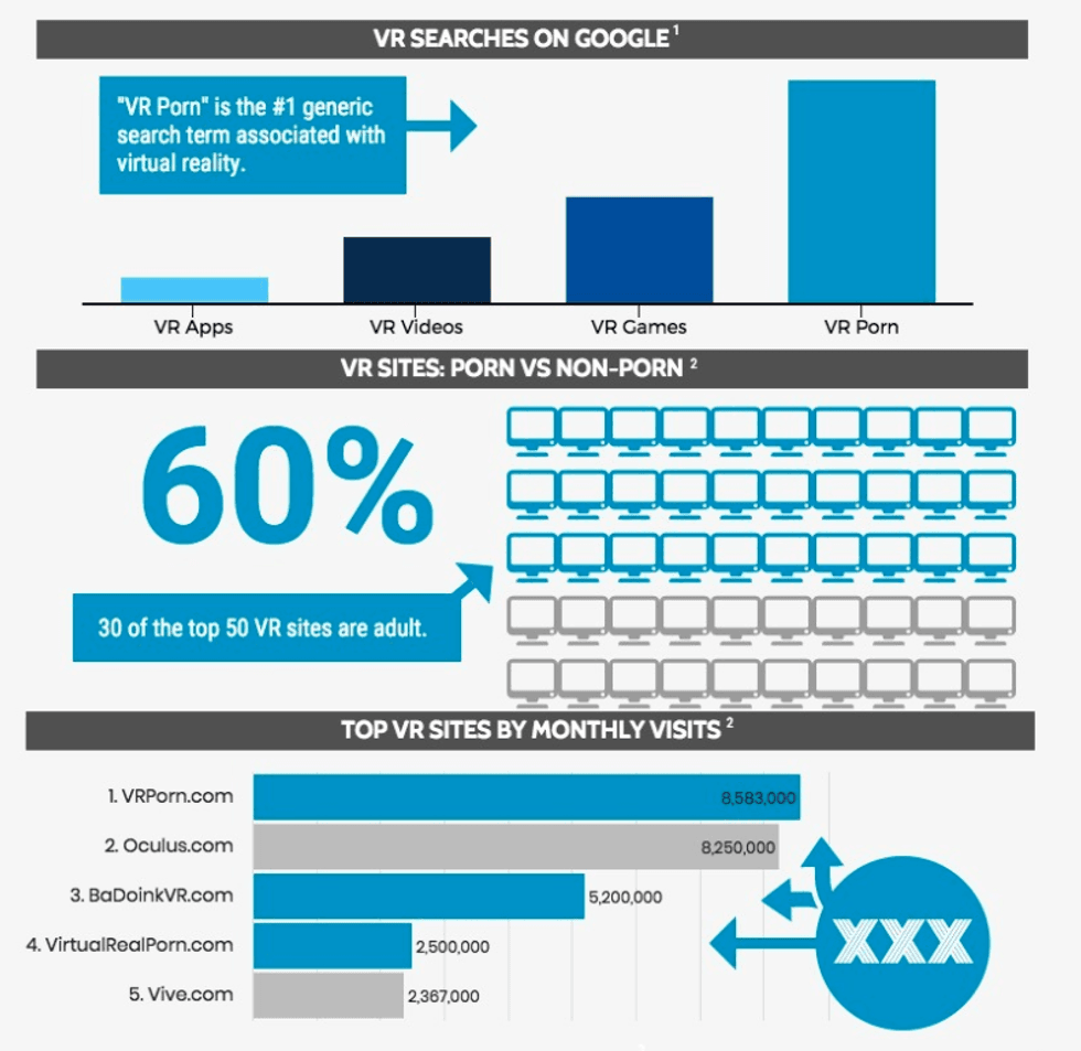 It was only two years ago when US adult entertainment company Naughty America showed off its VR content for the first time, promptly followed by many other production companies following suit. Now, according to data produced by VRPorn, 30 of the top 50 virtual reality websites are adult entertainment; furthermore, these sites are ranked number one, three and four in overall VR site rankings.