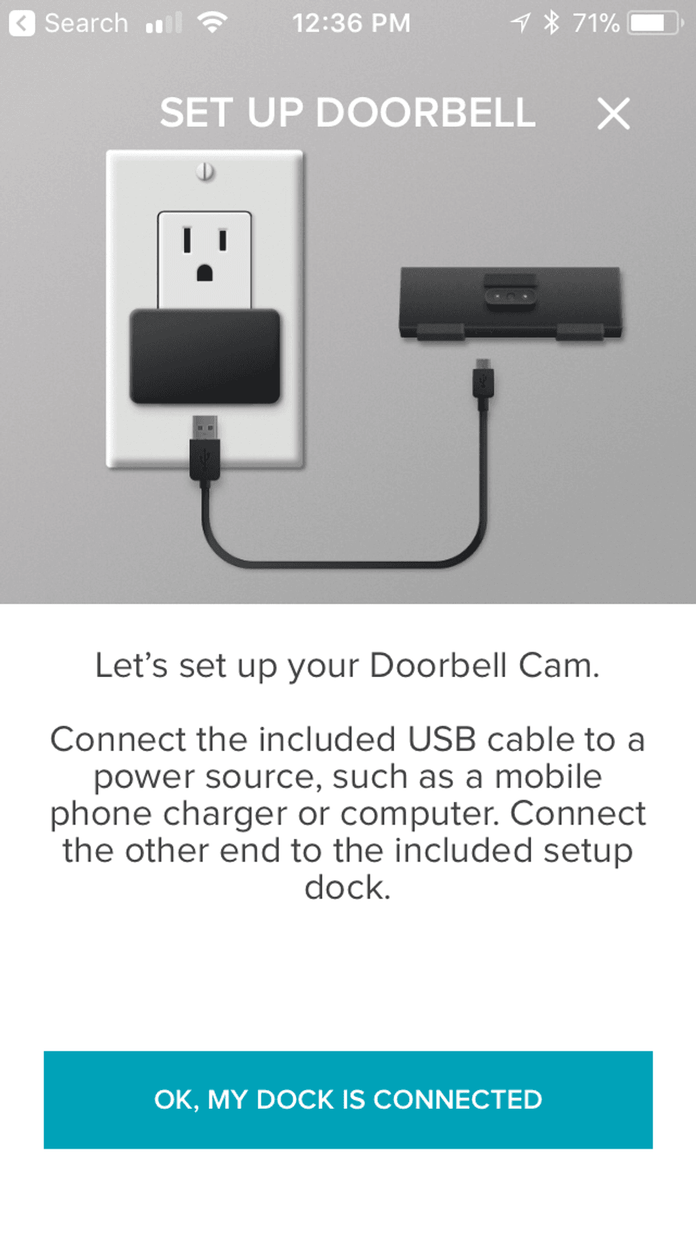 To install the Doorbell Cam Pro, start by charging the device. Take the USB charging dock, which is inside the box, and and plug it into a smartphone charger — this will allow you to connect to the camera during setup without it having to be on the side of your house, making installation run more efficiently.