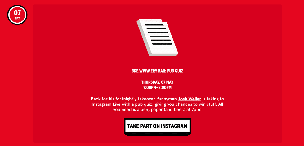 Another UK option — but which takes place on Instagram — is Camden Brewery. Upcoming events include live music on April 30 (8:00pm BST), and pub quizzes on May 7 and 21, both starting at 7:00pm BST. Prizes include beer, obviously, and while it is free to enter, a virtual tip jar has been set up to help restaurant bar staff who are struggling financially during lockdown.