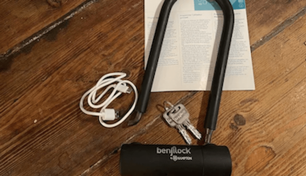 The Benjilock Fingerprint Bike Lock has a steel shackle, that's got the heft behind it. The lock works with a single touch fingerprint — and you can store up to 10 — and the battery, once charged, works for up to six months.
