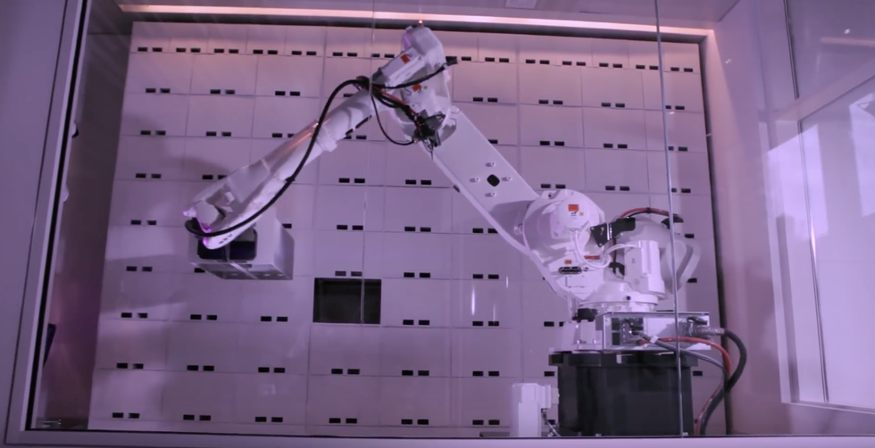 Using a 20-foot arm, the robot takes guests' bags and stores them in compartments until they return to retrieve them later.