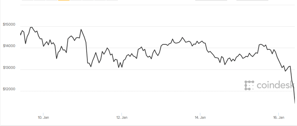 The price of bitcoin has fallen to below $11,500 per coin, having slumped over 15 percent in a single day and lost some 40 percent of its value since a record high of around $20,000 in December.