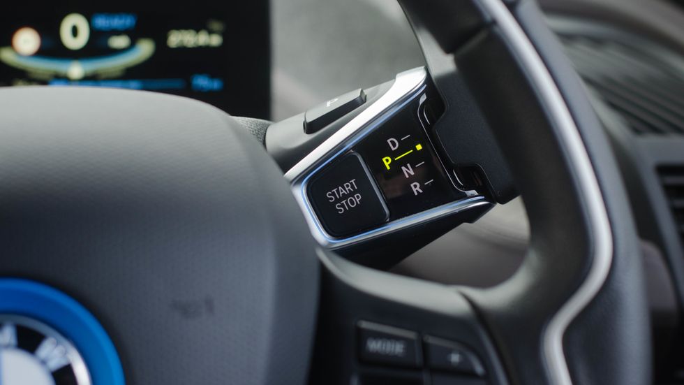 BMW normality is restored when you look at the steering wheel. Here you will find the same media and cruise control buttons as on other vehicles in the range. Being kitted out with a wide range of options, this particular i3 includes both radar-guided cruise control and a lane-keeping assistant which nudges the wheel to keep you between the white lights of the highway. There are also conventional stalks for the wipers and indicator, and a dial for the lights. The gear selector is sat at two o'clock and features an embedded start/stop button to switch the car on and off.