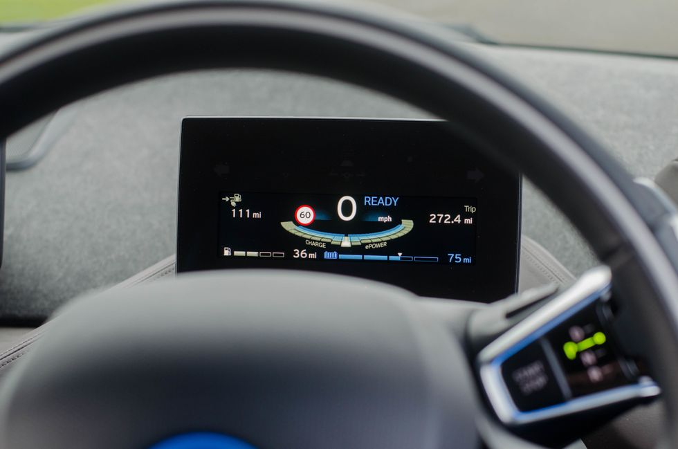 There are two displays inside the i3, replacing all conventional dials and readouts. The smaller of the two sits behind the steering wheel and displays critical information like your speed and the local speed limit (as spotted by sign-reading cameras), and above the display are lights for your indicators, fog lights, high beam etc. The majority of the display is taken up by a graphic showing whether the battery is charging or being used.