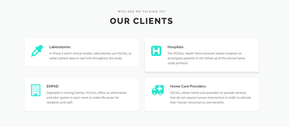 The Vocall website claims its clients include laboratories, who use Vocall "to collect patient data in real time throughout the study", along with hospitals and home care providers.