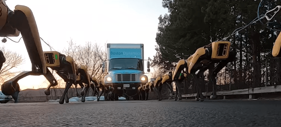 This time, ten of the robots, called SpotMini, are shown pulling a box truck, like futuristic huskies pulling a sled. Arranged in pairs, the dogs stand up in unison and begin pawing at the ground, before slowly heaving the truck across a parking lot and up a small incline.