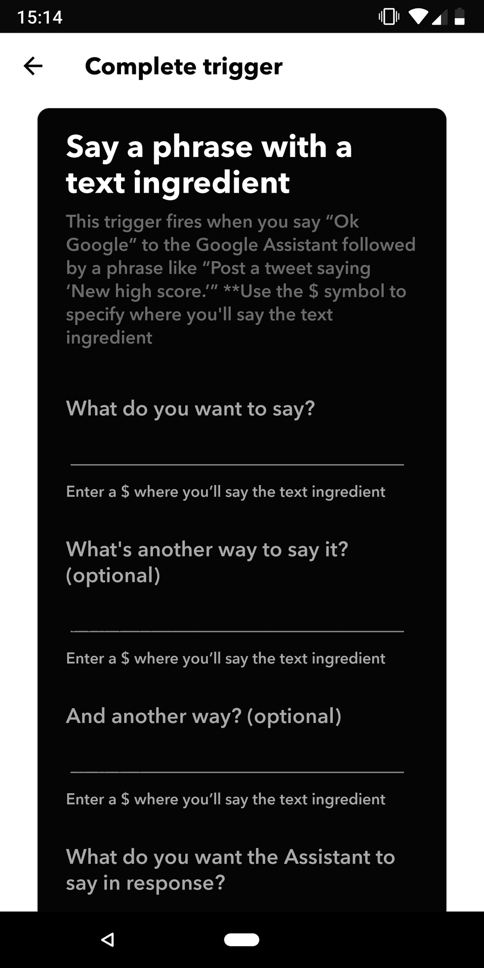 Now you will see the 'Complete trigger' screen, where you tell the applet what spoken phrase you want it to act upon, and what you want Google Assistant to say in return.