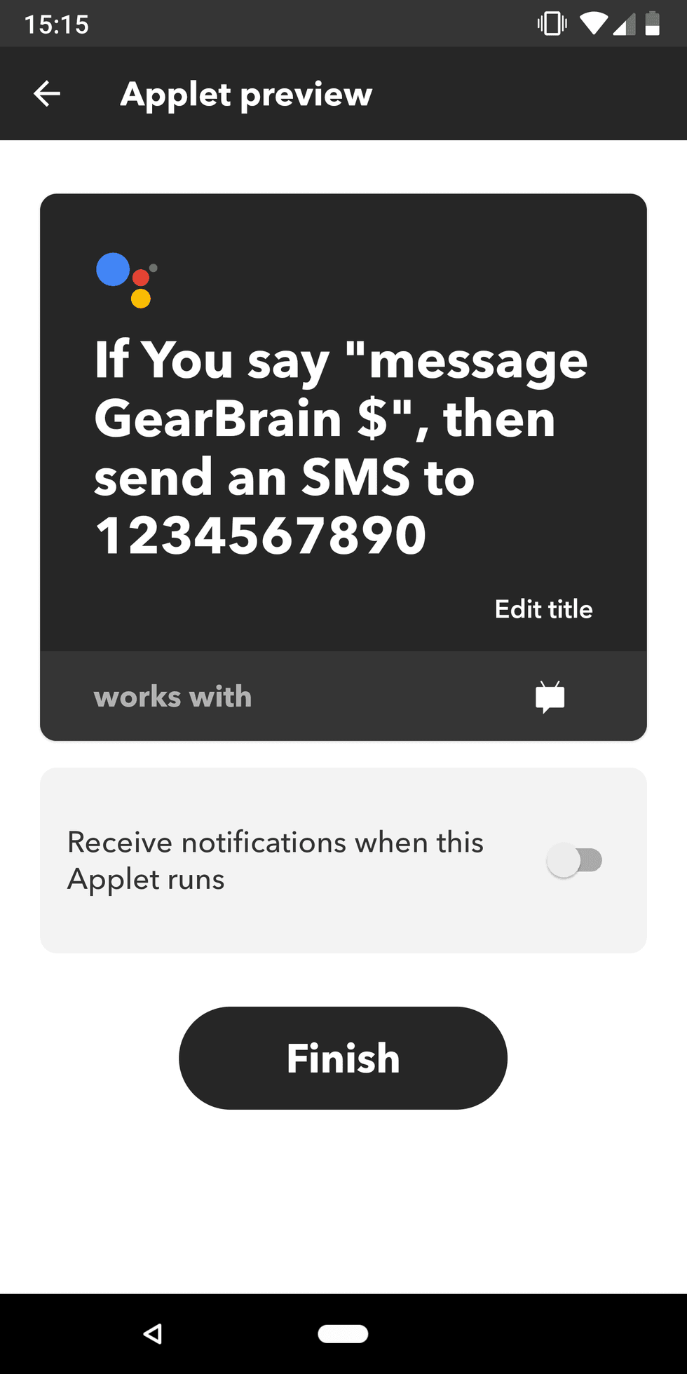 You will now see a summary of your new applet. Tap Finish to build it, then tap the on/off switch to activate it.