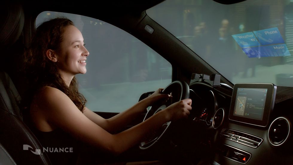 During a demonstration for GearBrain on the CES show floor, Nuance showed how its vision for a new head-up display includes an interface beamed across the windshield. Semi-transparent and located in the center of the screen - so off to the right of the driver's straight-ahead - the interface is interacted with my glancing and speaking.
