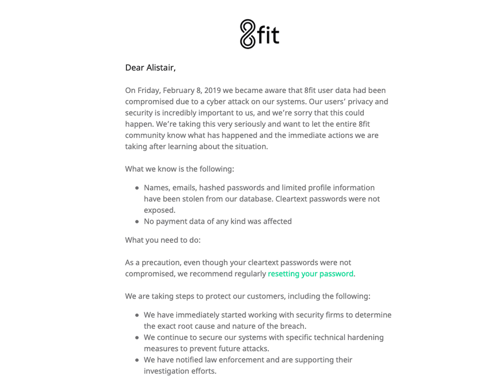 The admission comes in the same week that 8fit, a fitness application, also told users - including this reporter - that it was the victim of a cyber attack. The fitness company said it become aware of the data theft on February 8, and urges users to reset their passwords.