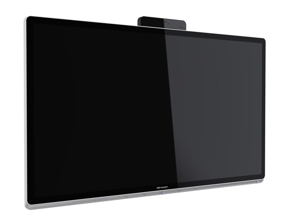 These huge displays — the Sharp unit demonstrated on stage measured 70 inches — are designed to be powered by a connected PC or laptop, bringing the cost down, and feature a high-resolution cameras designed for whole-office conference calls.