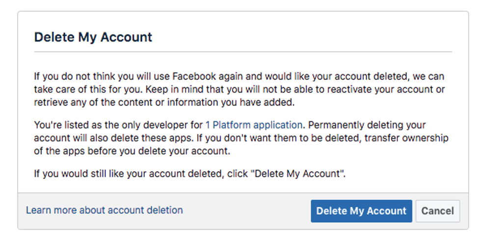 Before you permanently delete your account, you should consider downloading your profile by clicking 'Download a copy of your Facebook data' on this page. This includes photos and chat archives, but also things like facial recognition data and information about which adverts you clicked on.