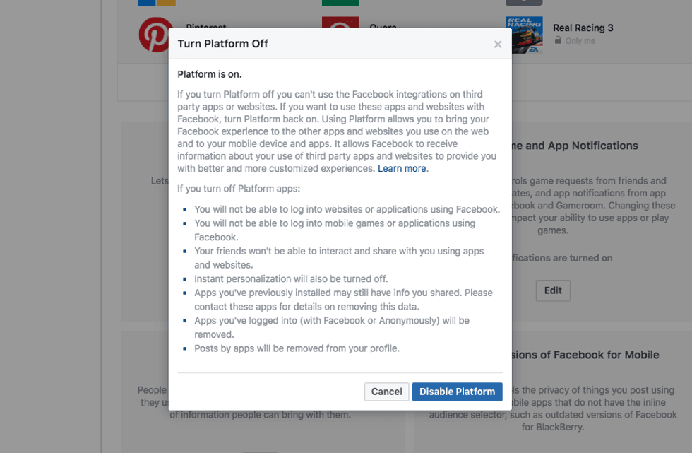 This is a less drastic step, but still not one for the faint hearted; turning Platform off will shut down all Facebook integration with third parties. This includes any website or app which you have logged into using your Facebook ID, including WhatsApp and Instagram. Switching Platform off will also delete any posts made to your Facebook page by third parties, and friends will not be able to contact you through third-party apps, even if you are still friends with them on Facebook.