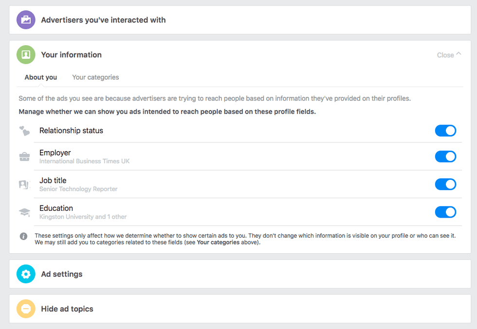 Next is a section where you can adjust what personal information Facebook uses to target adverts at you. This list includes your relationship status, employer (which for me was inexplicably out of date), job title and education. Each of these can be switched off, further limiting Facebook's ability to target adverts at you.