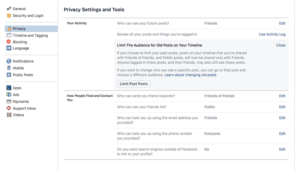 A good start is to change 'Who can see you future posts?' to Friends only, then click on Limit The Audience for Old Posts on Your Timeline. Doing so means that older posts on your timeline can only be seen by current friends, as well as people tagged in these posts, and their friends. This isn't great, and Facebook's claim that friends of people tagged in your previous posts "may" also still see these posts doesn't help the situation