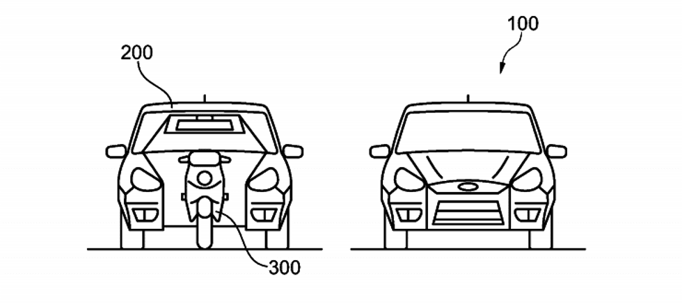 The bicycle or motorcycle — Ford uses both words in the patent — would notably be able to tap into the car's system and display including an on-board computer, radio and navigation system, even after separated from the main vehicle. Of course Ford supposes the motorcycle could have a rechargeable battery — and both the car and bike could keep moving even after detached from each other.
