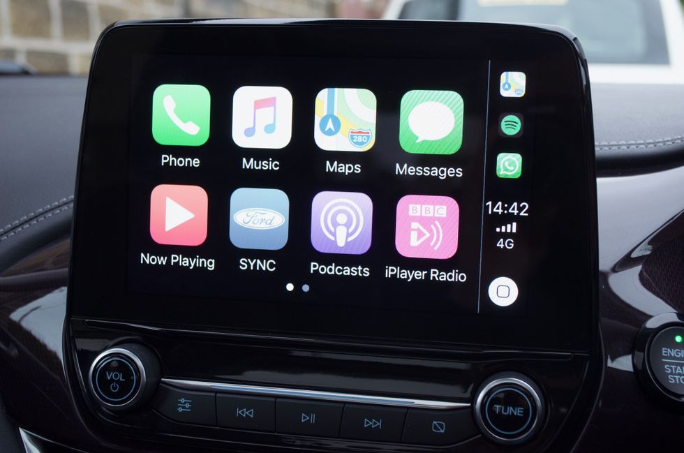 CarPlay works here just as it does on other cars, as the processing is done by the phone itself rather than the car's computer. With CarPlay you can use apps like Maps, Podcasts, Music and Spotify apps from your phone, plus Phone, Messages and WhatsApp. Some are navigated by touch, while others — like Messages and WhatsApp — can only be used by talking to Siri.