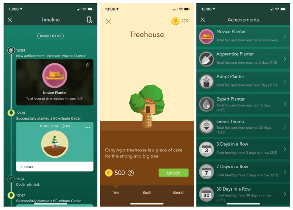 There are daily, weekly, monthly and yearly views of your forest, so you can see how your concentration has changed while using the app, and there are graphs to show the data in a more quantifiable way. Points can be used to unlock new items, such as tree houses, or exotic breeds of plant to make your forest look more interesting — a forest which you can share with friends and fellow app users via social media, of course.