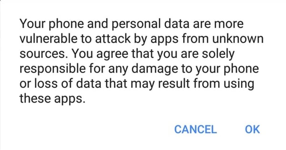 However, Google knows this can potentially lead to Android owners installing dangerous and malicious apps onto their phones. As such, users who allow access to unknown sources are warned: "Your phone and personal data are more vulnerable to attack by apps from unknown sources. You agree that you are solely responsible for any damage to your phone or loss of data that may result from using these apps."