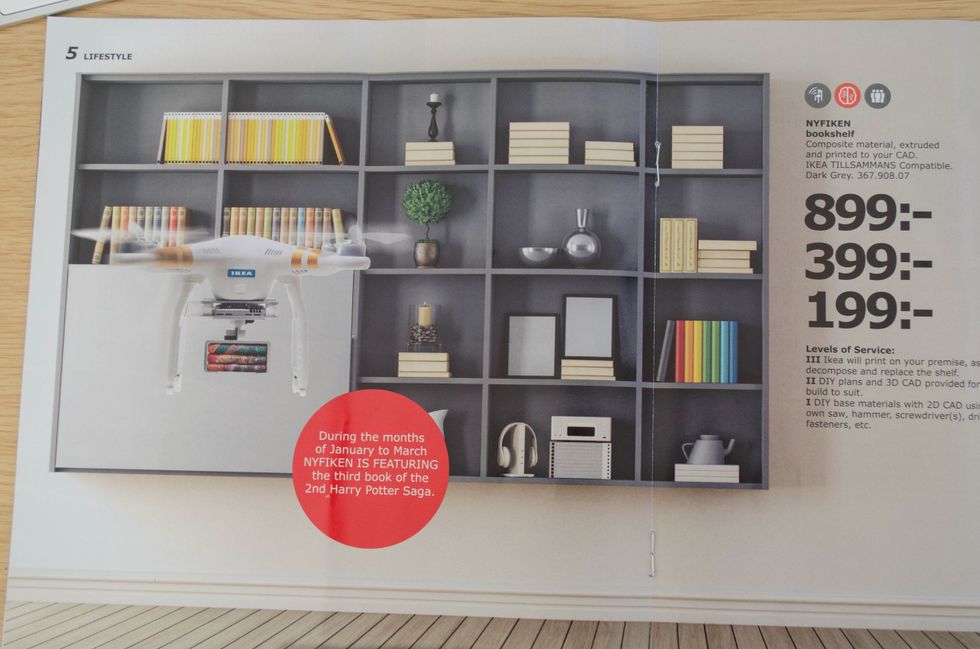 Flicking to the lifestyle section, and today's popularity of subscription services is combined with a traditional bookshelf. The catalogue suggests news journals, books, and other materials could be delivered regularly to keep the bookshelf up-to-date. Books are delivered by drone, of course, and the contents of each delivery is personalized based on your "daily activities." Both of these aspects are closely aligned what Amazon does today, predicting your shopping habits and developing a drone delivery service, called Amazon Prime Air.