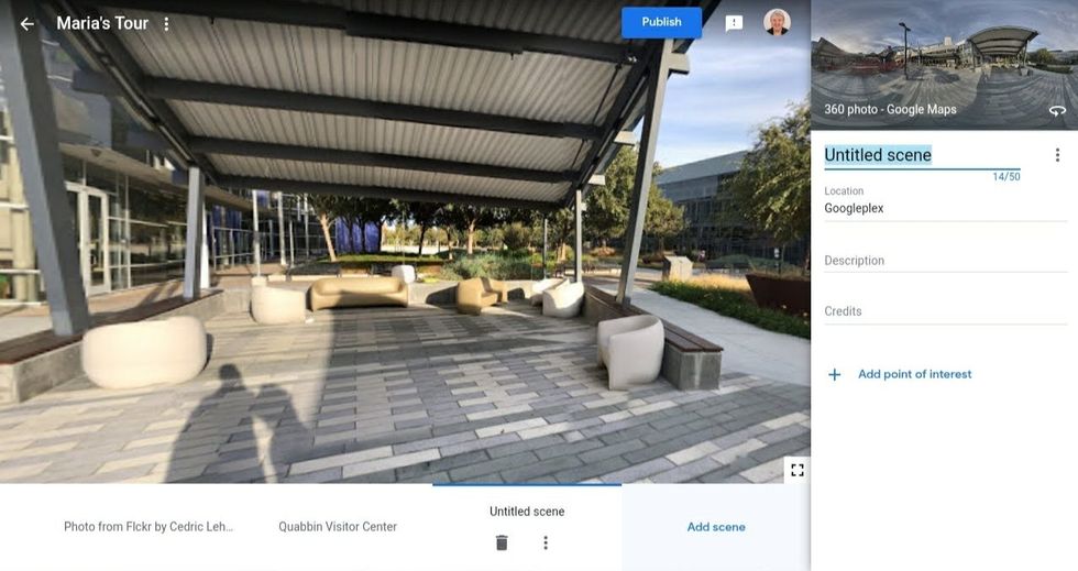 Click on the "Add scene" button, and either look for a Google Maps location or click on the "Upload" button to use your own photo.