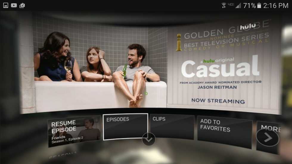 Once logged in, I saw the familiar Hulu interface. My movies and television shows were all visible and navigation, using the Gear VR's trackpad and back button, was very easy.