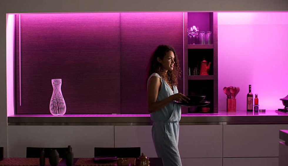 Popular places for light strips include behind the television, above and below kitchen cupboards, and under or behind items of furniture like wardrobes, beds and sofas. The trick is to completely hide the light strip from sight, so instead of seeing the individual LEDs, you see the pool of light they create. Strips with LEDs places closer together (a downside of Hue strips) helps here.