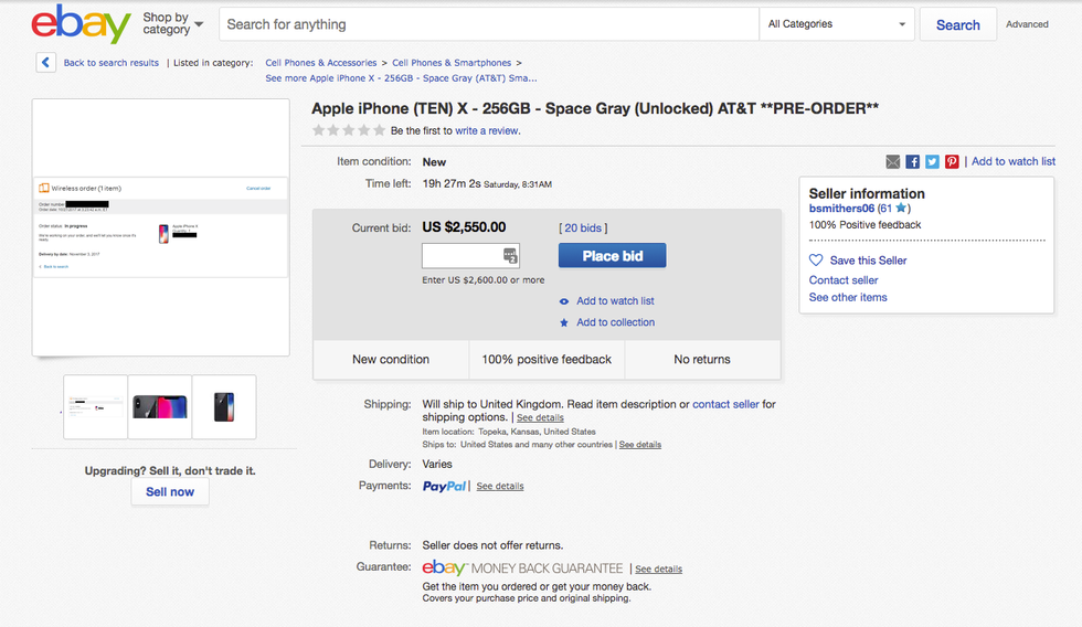 GearBrain found a 256GB iPhone X in space gray which had attracted 21 bids, the highest being $2,650 — a full $1,400 over the recommended retail price.
