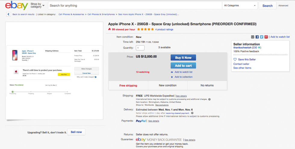 It was a similar story across the Atlantic, where Brits were asking £5,000 for the iPhone X on eBay. The highest we could find with any bids — 30, in fact - was priced at £1,700 at the time of writing, giving the seller a profit of £551 ($710) before eBay's fees.