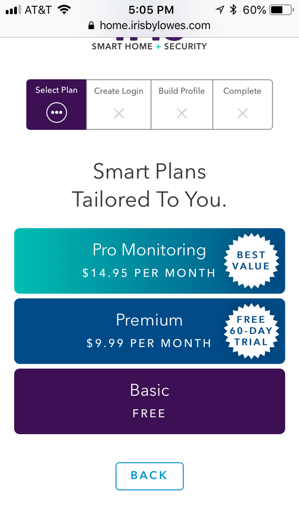 Iris surprised us by asking that we choose which which smart plan we wanted right at the start: pro-monitoring, premier, and basic. Normally we see this later in the setup so get ready to choose.