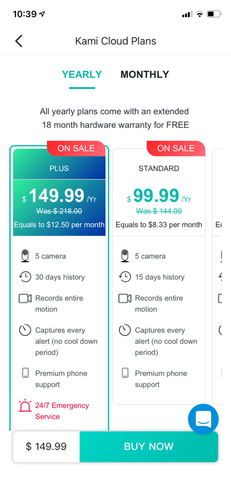 What did surprise us a little with Kami Mini was its cloud storage plans. The company offers a variety of plans which range from simple video storage on one camera to a plan for five cameras, 300 days of rolling video recordings and 24/7 emergency service. Many of the plans are competitively priced , while some are rather expensive. However, it's worth noting that the 24/7 emergency service feature was only on one plan – Kami Cloud – which cover five cameras for $149 per year. We think this is a feature that should be offered on all plans ideally.