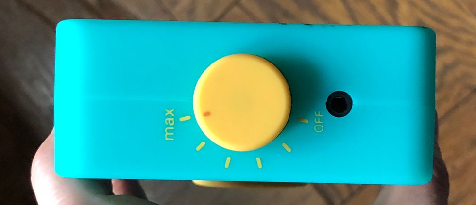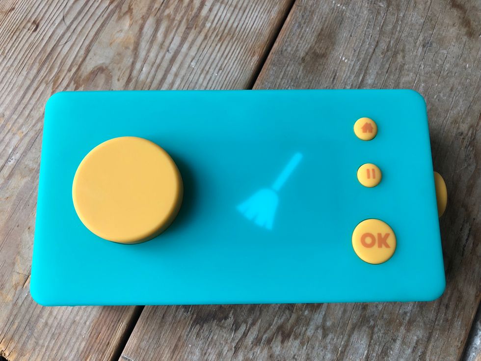 Covered in an aqua colored skin that rubberized so it's easy to hold, Lunii has just five bright yellow dials and knobs — big and chubby enough even for tiny fingers. One knob lets you stop the story, another starts the tale, a third takes you to beginning, a fourth controls the story elements from main character to place, and the fifth controls the volume.