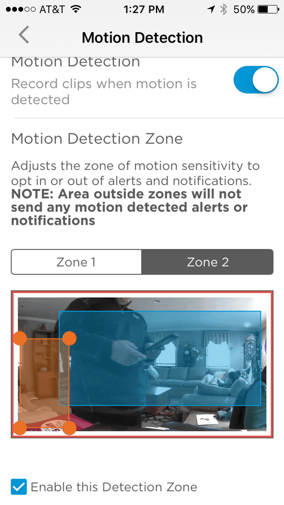 Another nice feature of the Lyric C1 Wi-Fi Security Camera is its adjustable alert zones. Using the Honeywell app, you can draw your own alert zones (2). When motion is detected in these zones, you will receive an alert.
