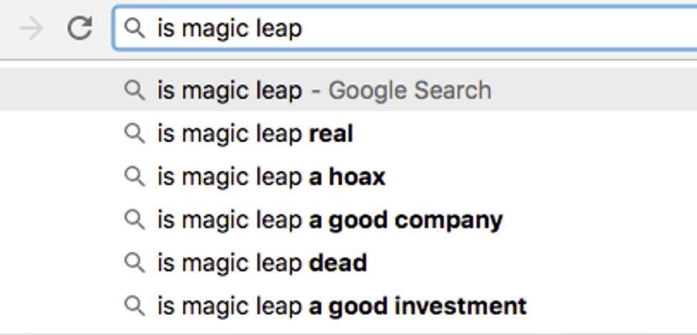 Yet, while delays are par for the course when developing new technologies like AR and MR, excitement for Magic Leap could soon turn to frustration and even suspicion. Just type 'is Magic Leap' into Google and look what you get: