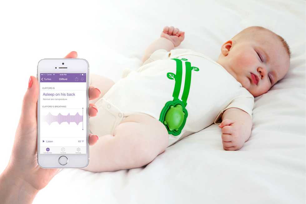 The Mimo Smart Baby Monitor gives parents up-to-the-moment detail on baby's sleep, breathing patterns, body temperature, and body position. You can either tune into the app to check in, or sign up to be sent notifications when there is any change in your baby's body or movements. All this monitoring is captured thanks to a Bluetooth sensor they call the “turtle" which snaps onto the outside of the onesie, or “kimono". (And yes, the device is green and has a turtle shape.)