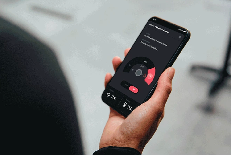The temperature can be adjusted manually via a companion smartphone app, however, which connects to the machine-washable jacket via Bluetooth. Machine learning is used to note your preferred temperature, helping the jacket adjust to your needs the more you wear it. An accelerometer detects when you are moving and decreases the heat; stand still in the cold for while, and the heaters kick back in.