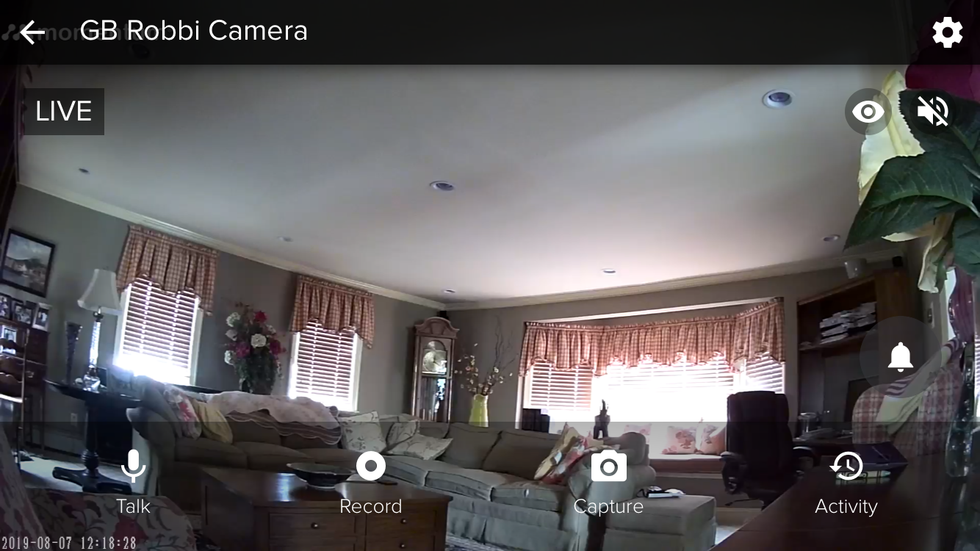 When viewing live video through the app, you'll see four icons at the bottom of the phone's video screen: talk, record, capture and activity buttons. The Settings icon is in the top right-hand corner, a speaker icon, and a bell icon as well, which will trigger a loud siren on the camera. While you may not hear the sound from outside the home, we know it will scare people inside. The speaker icon is typically muted, but if you touch it, you'll be able to hear sound from the Robbi camera in the room.