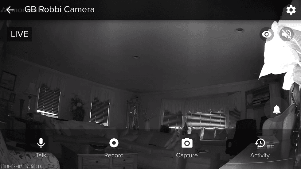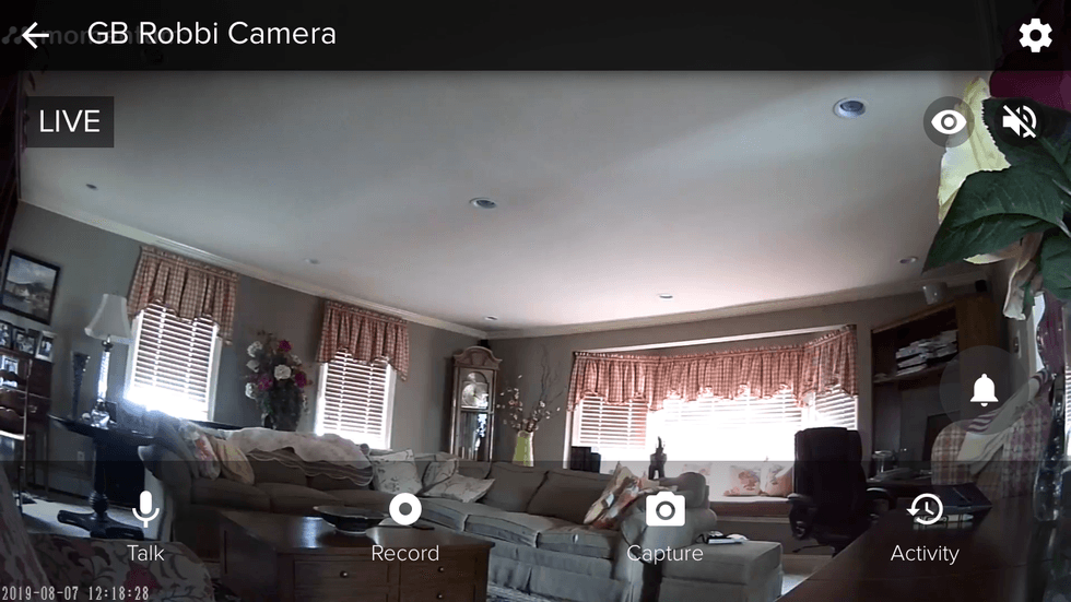 When viewing live video through the app, you'll see four icons at the bottom of the phone's video screen: talk, record, capture and activity buttons. The Settings icon is in the top right-hand corner, a speaker icon, and a bell icon as well, which will trigger a loud siren on the camera. While you may not hear the sound from outside the home, we know it will scare people inside. The speaker icon is typically muted, but if you touch it, you'll be able to hear sound from the Robbi camera in the room.